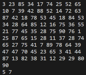 첫째 줄에 최댓값을 출력하고, 둘째 줄에 최댓값이 위치한 행 번호와 열 번호를 빈칸을 사이에 두고 차례로 출력한다. 최댓값이 두 개 이상인 경우 그 중 한 곳의 위치를 출력한다.