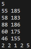 *key point: 몸무게와 키를 입력받아 2차원 배열에 할당하고, 반복문을 이용하여 서로 비교한다. 이 때 자신 보다 덩치가 큰 사람이 있을 때마다 1로 초기화 된 1차원 배열 body_rank에 더해준다.