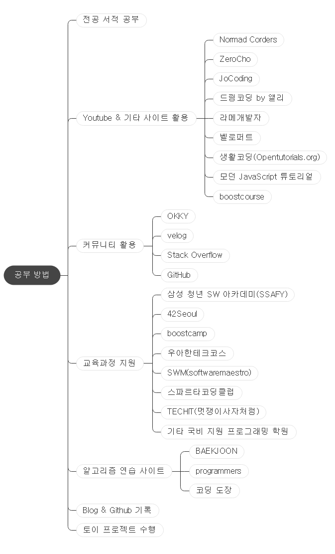 개발자 공부를 위한 자료들은 인터넷에 너무나 많다. 나만의 커리큘럼을 잘 짜서 공부하는 것이 중요할 것이다. 당분간은 하나의 코딩 부트캠프를 통해 실무에 필요한 지식과 프로젝트 경험을 얻고, 스스로 꾸준한 알고리즘 연습을 통해 내실을 쌓아갈 것이다.