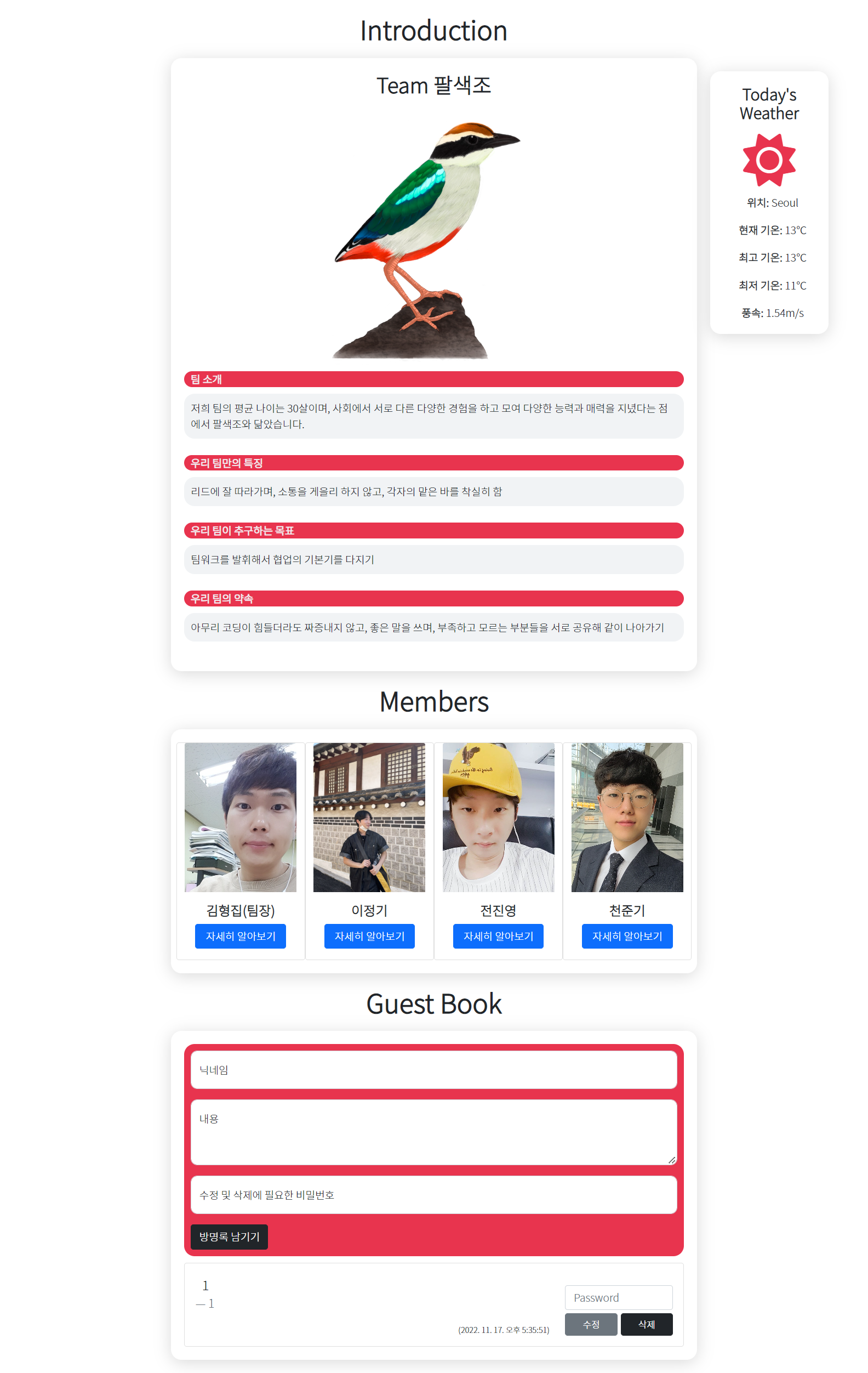 어느새 발표일이 하루 앞으로 다가왔다. 오전 중으로는 내가 짠 코드를 팀원분들께 보여주고 설명하는 시간을 가졌다. 설명을 하면서 조금은 나도 이해가 되기도 했고, 뭘 더 추가하면 좋을지 생각할 수 있었던 것 같다. 일단 기본적인 CRUD가 구현은 되었고, 오늘은 좀 더 나은 방법이 있는지 찾아보거나 비밀번호 기능을 수정 및 삭제 기능에 활용하고, 날씨 위젯 같은 기능을 메인페이지에 추가해보고자 했다. 그리고 저녁이후로는 모두의 개인 페이지를 메인페이지와 연결하고 발표 구상을 했다.