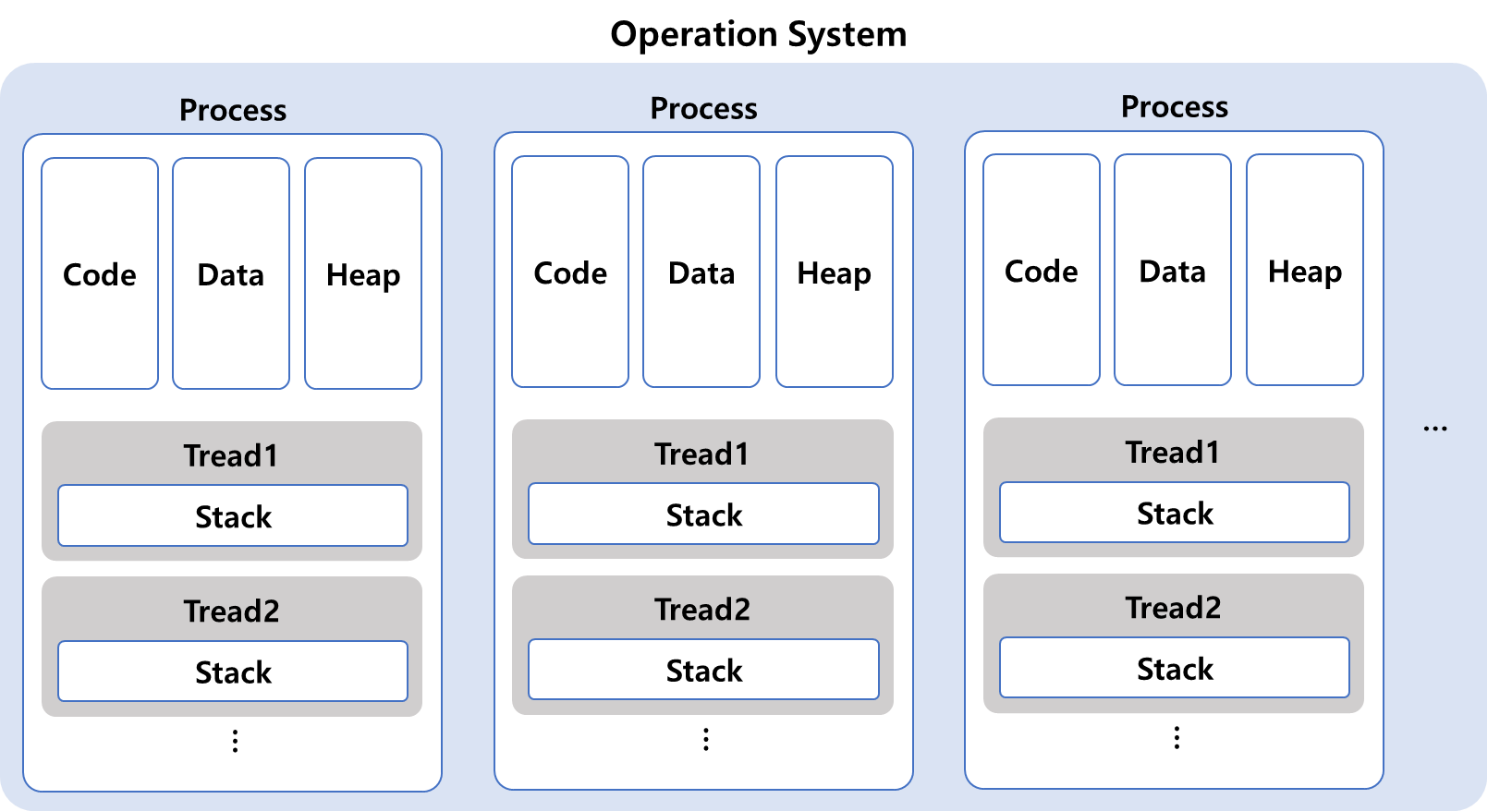 - 스레드는 프로세스 내의 Code, Data, Heap을 공유하면서, Stack만 따로 할당 받음