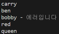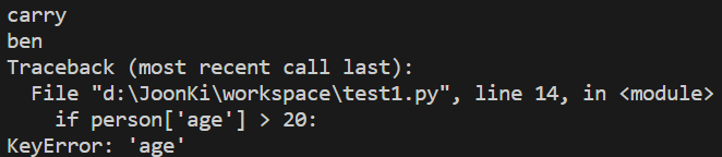 try - except 문을 이용하면 에러가 나는 경우 이를 넘어갈 수 있다. try - except문을 사용하지 않고 위의 예제를 실행하면, 20세 이상인 사람을 찾다가 'bobby'의 'age'가 없어 아래와 같은 에러가 발생하고 실행이 멈추게 된다.