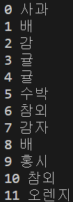 fruits = ['사과', '배', '감', '귤','귤','수박','참외','감자','배','홍시','참외','오렌지']
