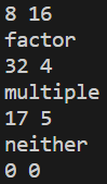 각 테스트 케이스마다 첫 번째 숫자가 두 번째 숫자의 약수라면 factor를, 배수라면 multiple을, 둘 다 아니라면 neither를 출력한다.