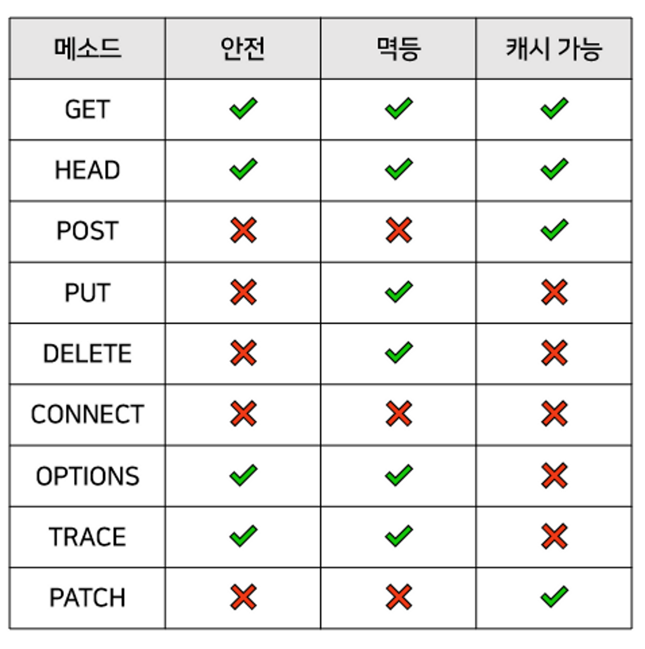 - 캐시가능(Cacheable Methods): 응답 결과를 서버에 캐시 해서 사용해도 되는 메소드