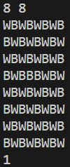 첫째 줄에 N과 M이 주어진다. N과 M은 8보다 크거나 같고, 50보다 작거나 같은 자연수이다. 둘째 줄부터 N개의 줄에는 보드의 각 행의 상태가 주어진다. B는 검은색이며, W는 흰색이다.