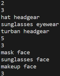 첫 번째 테스트 케이스는 headgear에 해당하는 의상이 hat, turban이며 eyewear에 해당하는 의상이 sunglasses이므로 (hat), (turban), (sunglasses), (hat,sunglasses), (turban,sunglasses)로 총 5가지 이다.