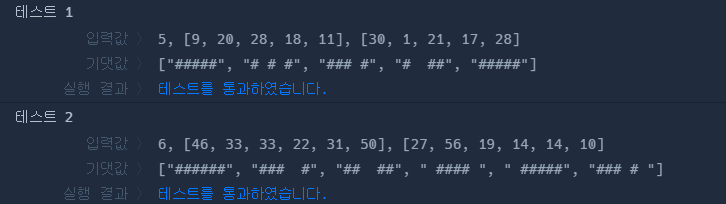 *key point: 십진수를 리스트 형태의 이진수로 변환하는 함수를 정의한다. 이를 활용하여 주어진 두 배열을 2차원 배열로 변환하고 반복문과 조건문을 이용하여 주어진 조건에 맞는 결과를 새로운 리스트로 출력한다.