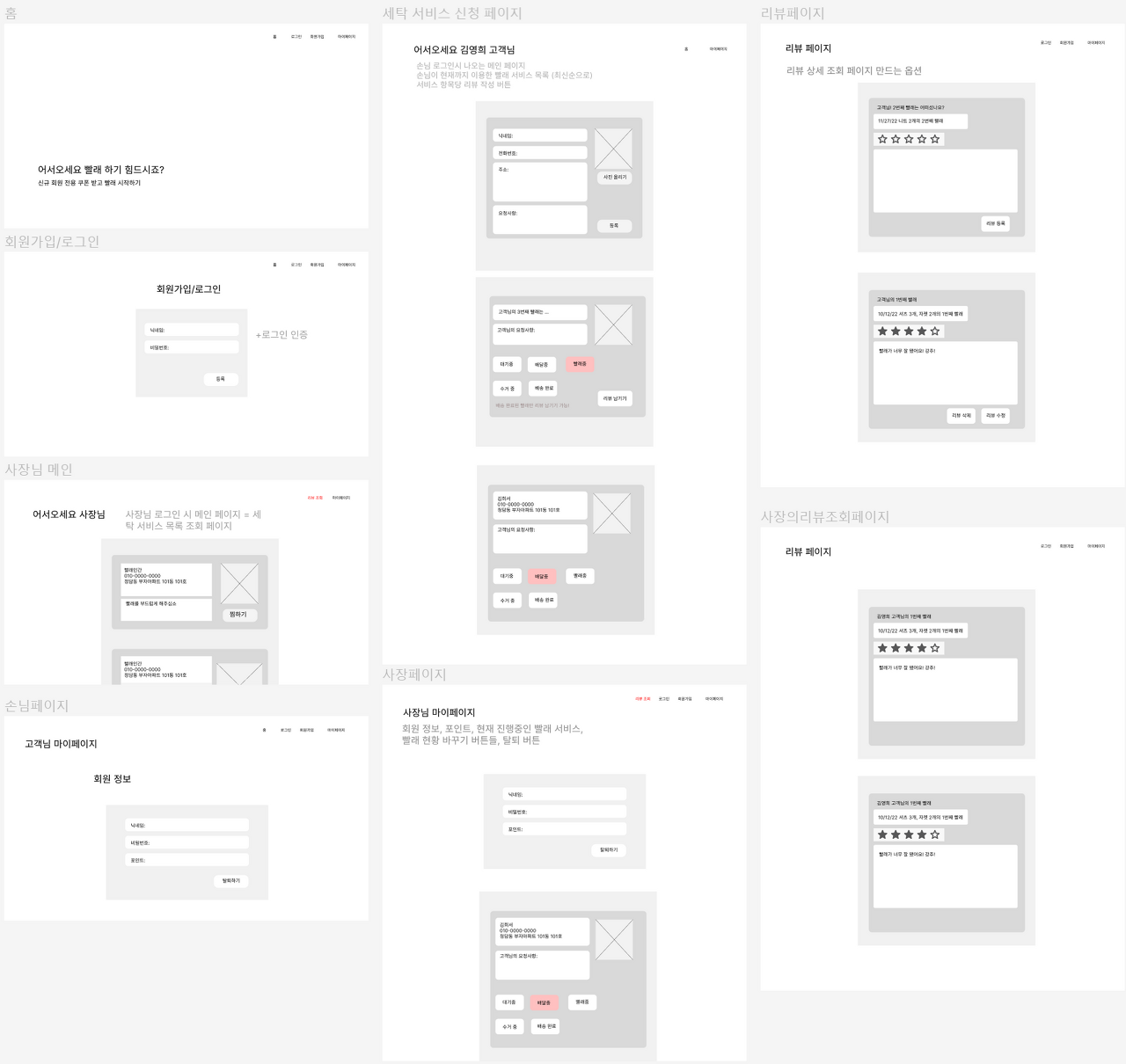 - 세탁 서비스 이용: 서비스 신청 및 상태 파악(손님), 서비스 진행 및 상태 업데이트(사장님)