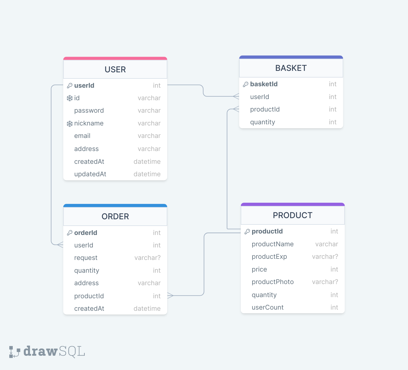 생각보다 DB를 설계하는 것이 어려웠다. 장바구니를 구현하고자 할 때 table 간의 관계가 생각보다 간단하지 않았다. 여러 논의를 통해 아래의 ERD를 짰고, 차후 진행하면서 문제가 발생하면 수정하고자 한다.