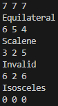 각 입력에 맞는 결과 (Equilateral, Isosceles, Scalene, Invalid) 를 출력하시오.