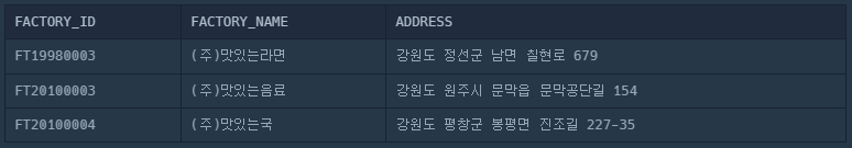 [programmers - MySQL] SELECT: 강원도에 위치한 생산공장 목록 출력하기