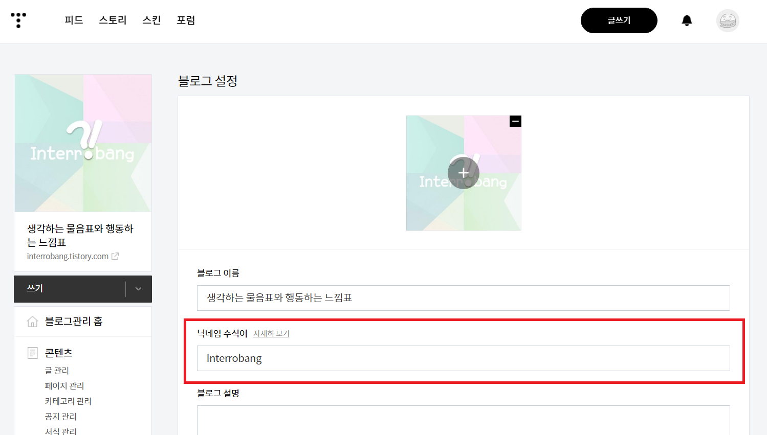 Tistory 닉네임이 두 번 나오는 오류 해결 (닉네임 수식어 설정)
